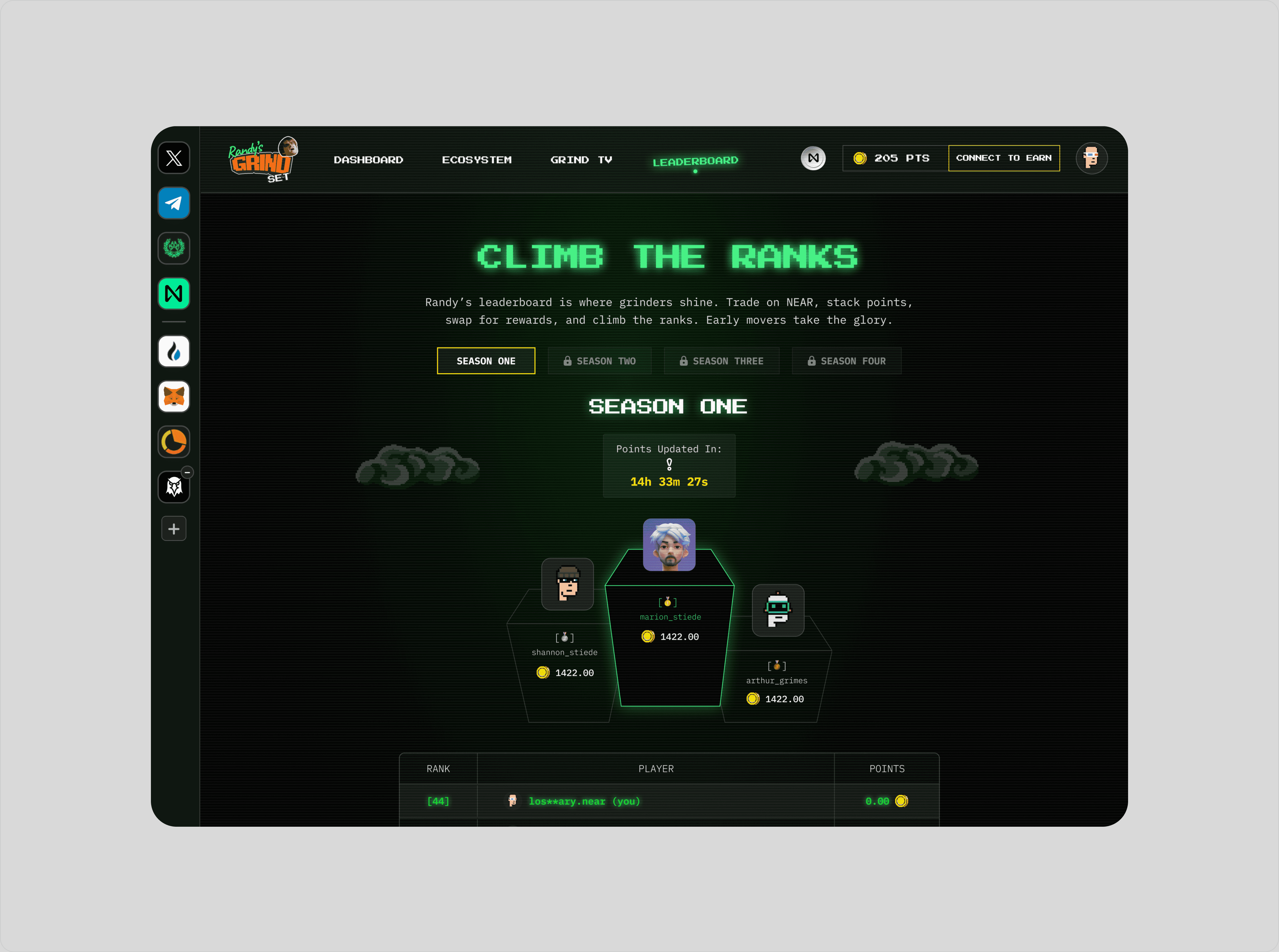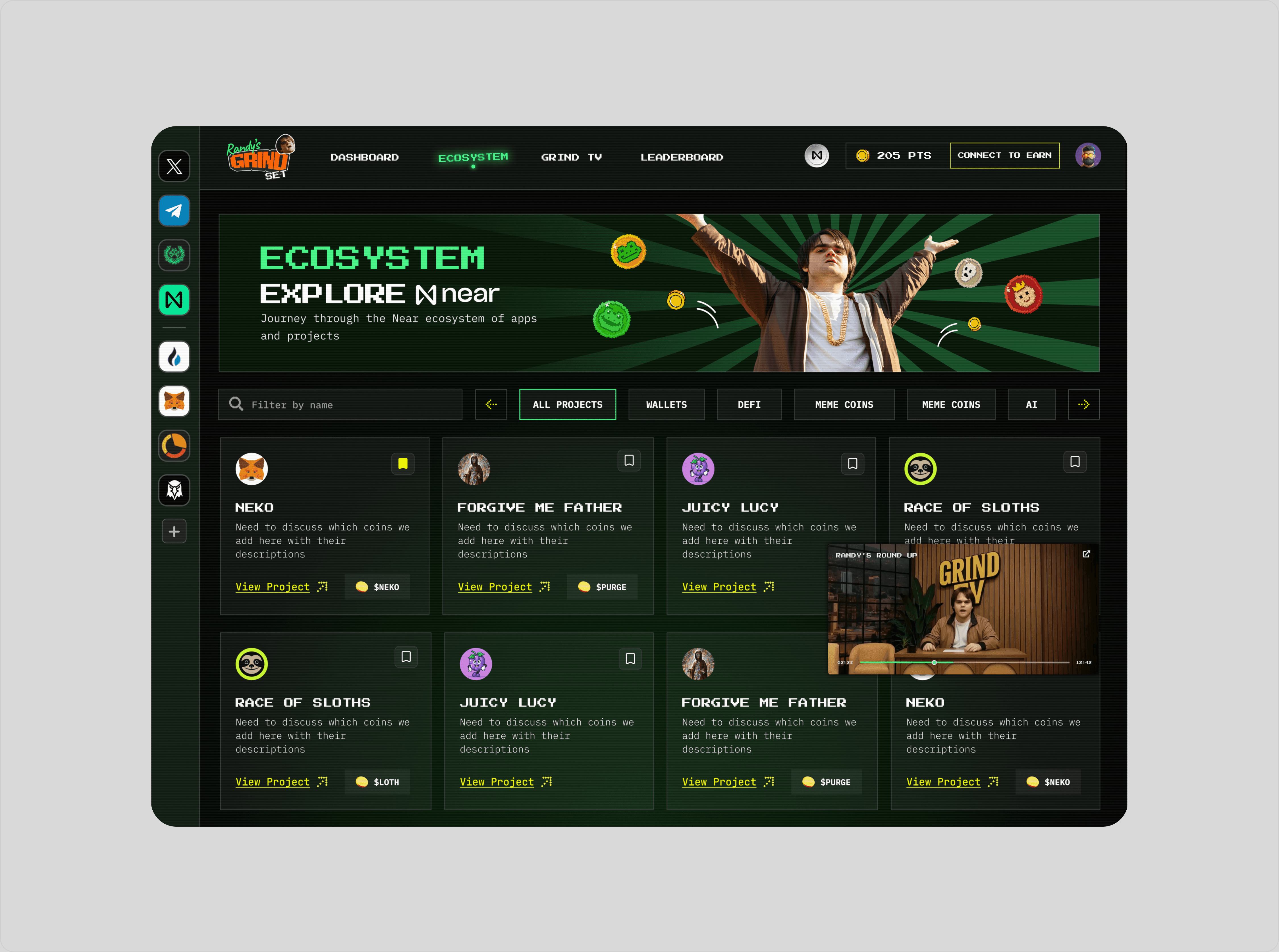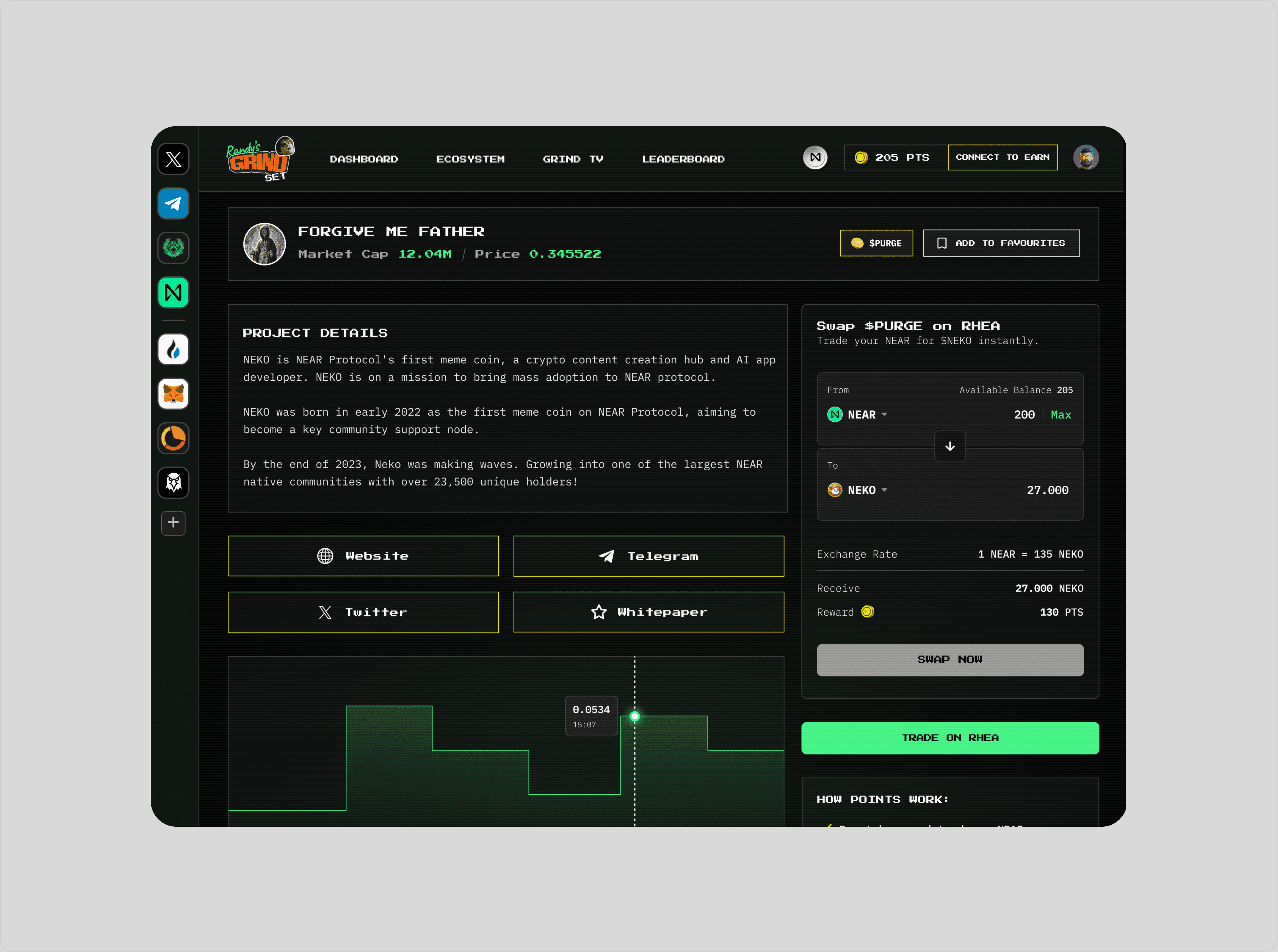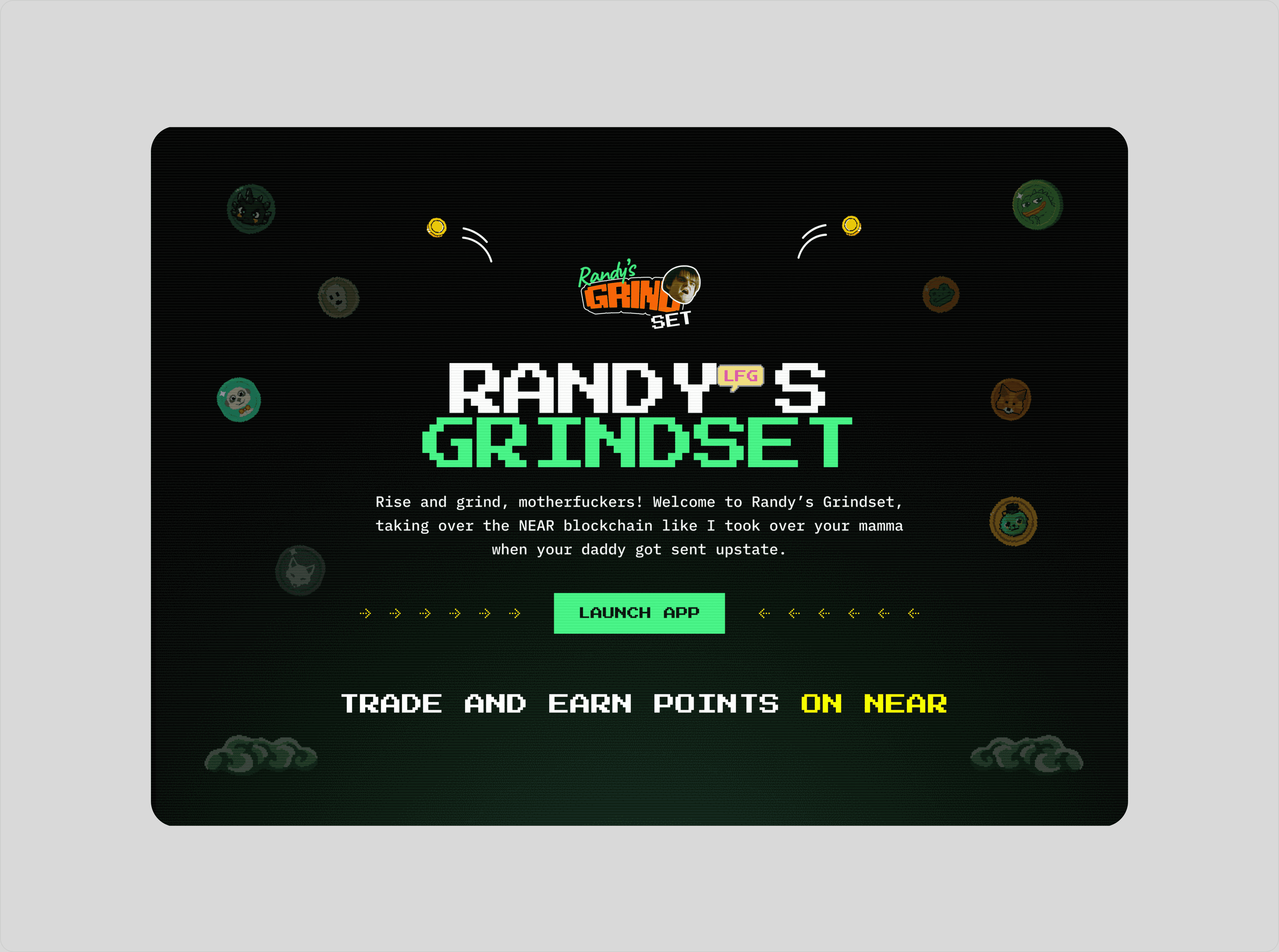 Randy’s Grindset is a trading platform built on the NEAR ecosystem that aggregates tokens and lets users trade, bridge, and earn points redeemable for $GRIND. I designed the full product experience, including token landing pages with live price, market cap, and holder data, as well as a points-based leaderboard that rewarded active users with an airdrop. The interface leans into a retro arcade aesthetic built around the degenerate character “Randy,” using gamified mechanics and bold visuals to turn on-chain trading into a competitive, playful experience without sacrificing functionality.