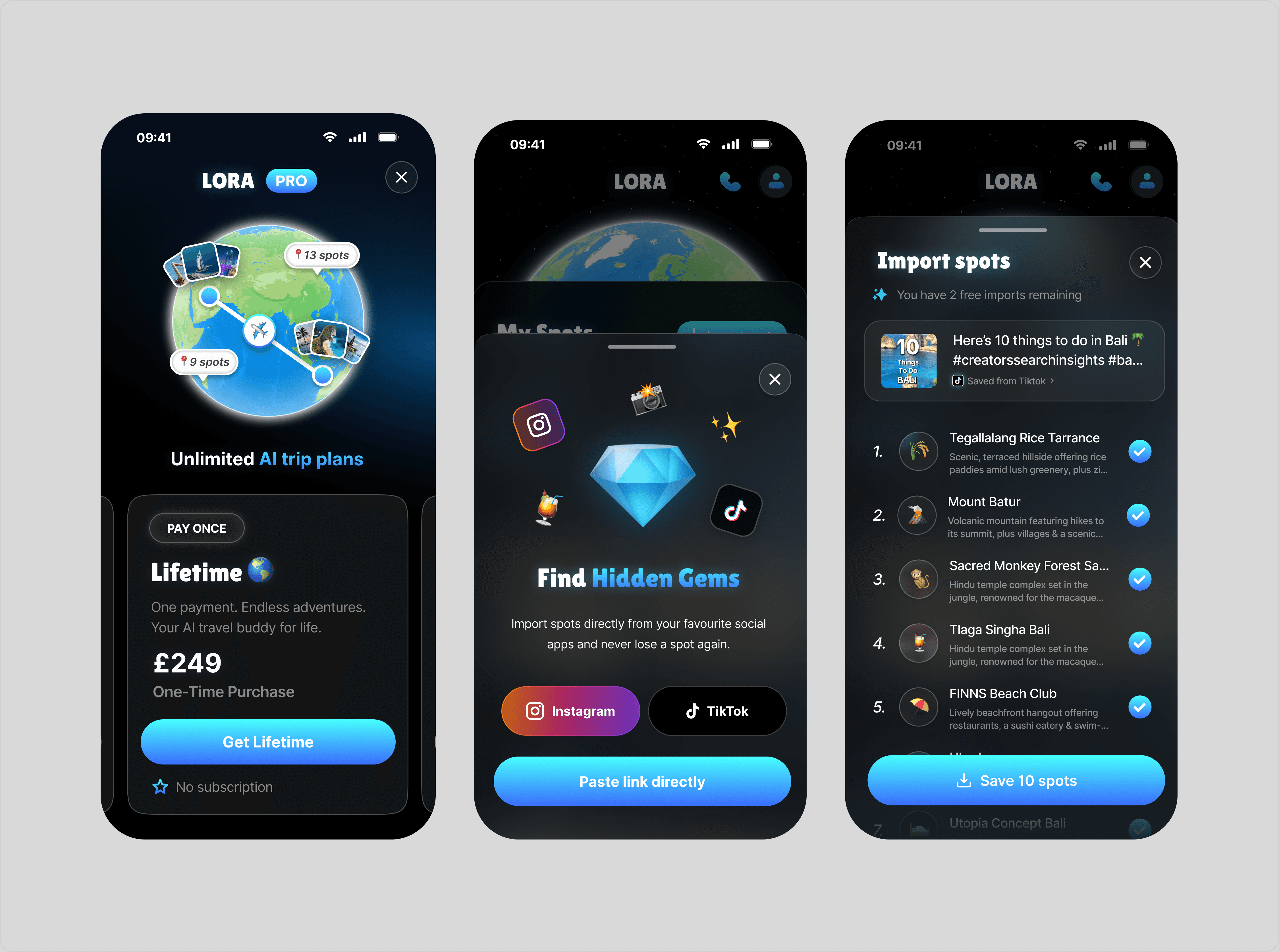 Lora is an AI-powered travel companion designed to simplify how users discover, save, and plan trips. The UI/UX focuses on turning inspiration from platforms like Instagram and TikTok into organised collections, shared plans, and personalised itineraries. By combining conversational AI with immersive maps and social features, the experience enables effortless trip planning while keeping exploration intuitive and engaging.