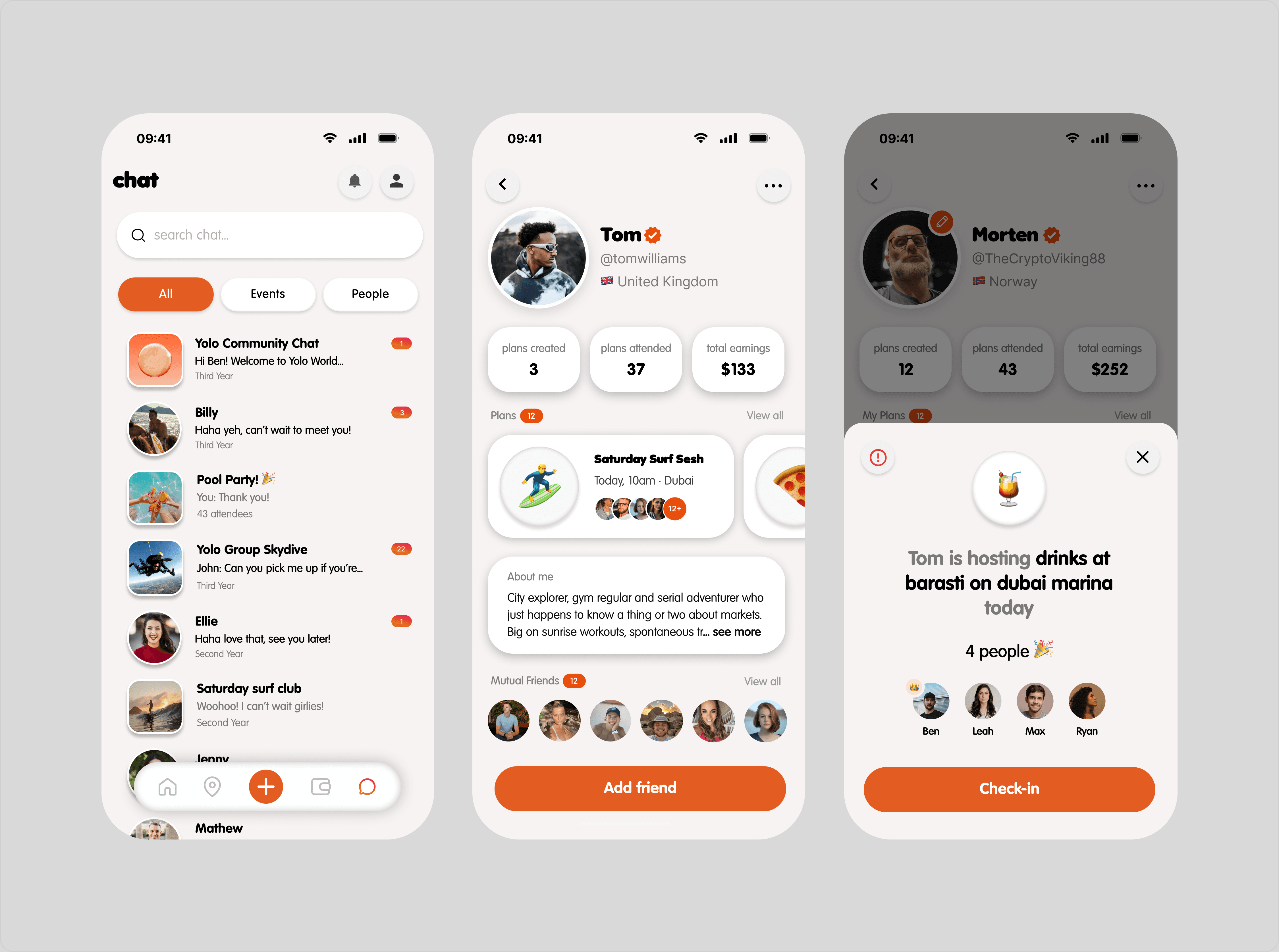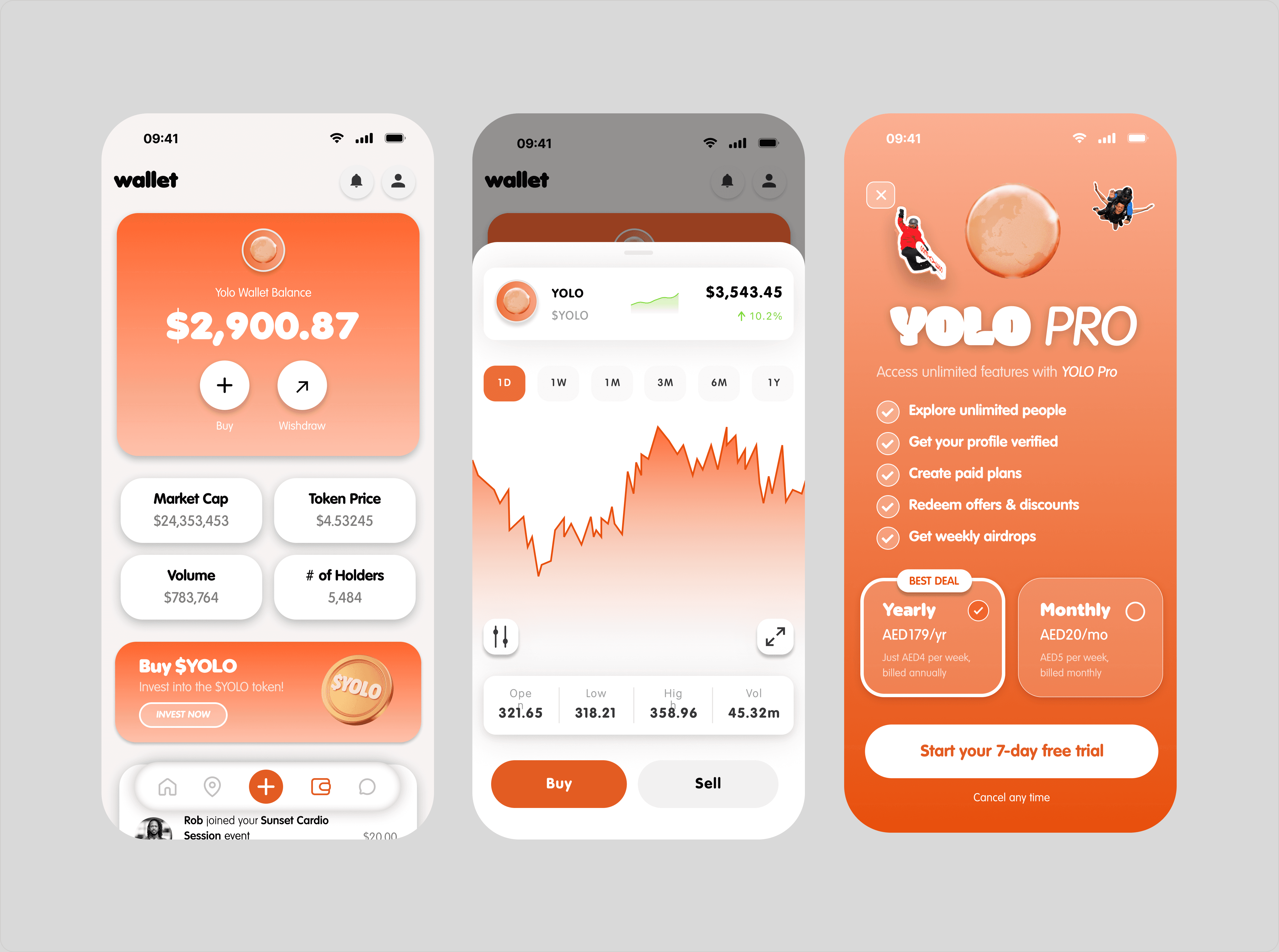 YOLO is a Web3 social app that rewards users for meeting up and socialising in real life. I designed the full UI/UX for the product, including discovery, map-based events, profiles, chat, wallets, and a premium subscription flow. The client specifically insisted on a white and orange visual system, which guided the overall look and feel of the app. The experience focuses on making IRL participation seamless and rewarding, guiding users from discovering events to attending, earning $YOLO, and managing everything directly within the app.